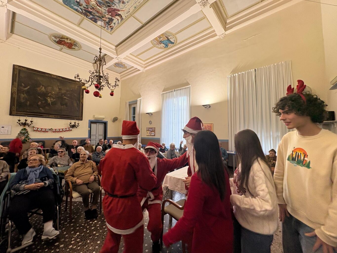 Questa mattina alcuni ragazzi della classe V liceo delle scienze umane hanno fatto visita agli anziani del centro diurno Villa Duchessa di Galliera . È’ stato un incontro pieno di allegria , dove generazioni distanti si sono sentite vicine intonando insieme ” Tu scendi dalle stelle ” e recitando poesie in genovese.